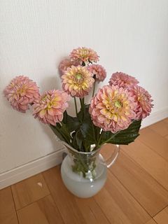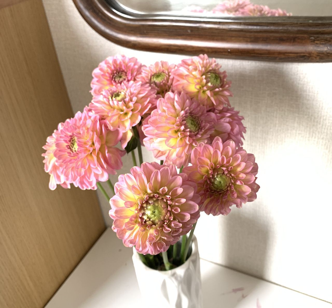 文字通りの桃色が可愛いダリアでした❣️ 濃いめと薄めとミックスされていて😍 ただ、茎がとても細いので扱うのが少し大変🤏 本数がもっとあったらいいのに、と思いました