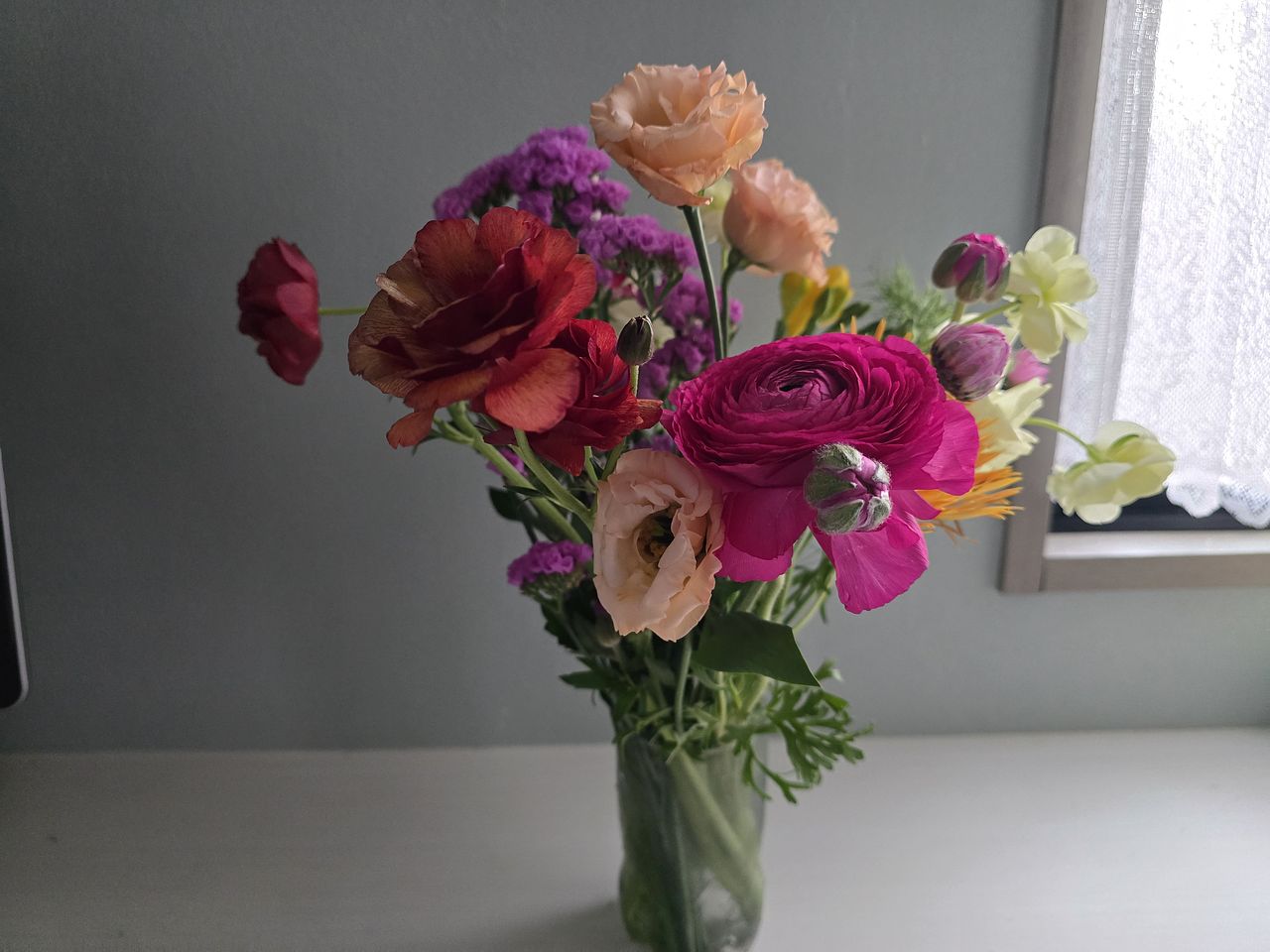 バラのいい香りと春色の花束が素敵でした オレンジ色のラナンキュラスかなと思われる花が一本花びらが散ってしまってましたが。