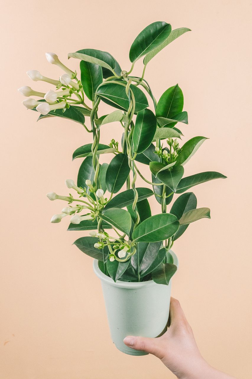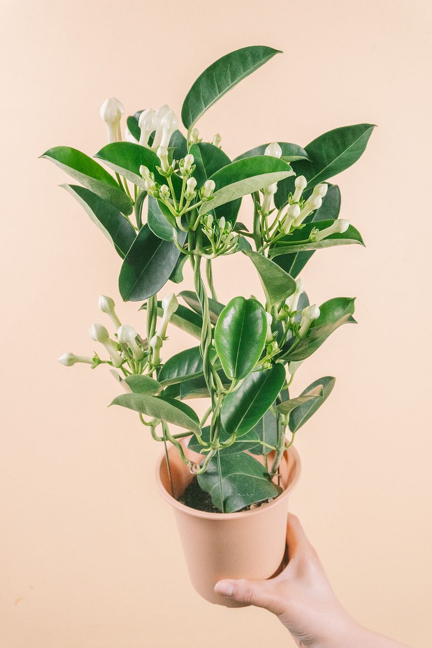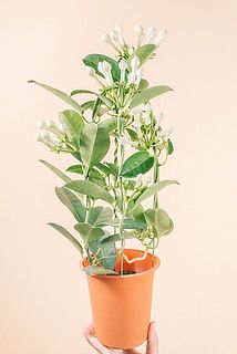 ふっくらした純白の花がかわいい🕊️ジャスミンに似た良い香りの「マダガスカルジャスミン」が入荷しました。欧米ではブライダルブーケとして使われることも。高さは50cmほど。