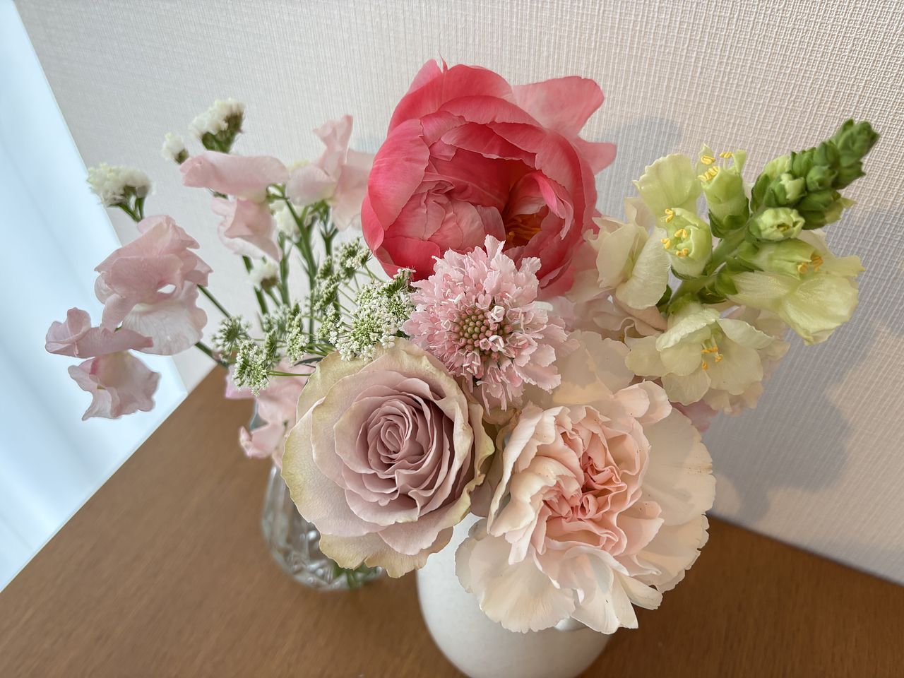 キュートないちごみるくのようなカラーのお花を束ねました🍓🥛