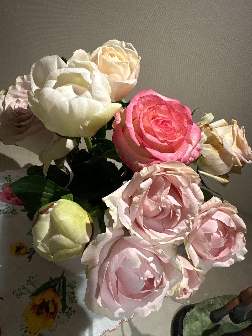 わが家に届いたブーケは、ピオニー3本、スプレーバラ3本、大きめなバラ3本。