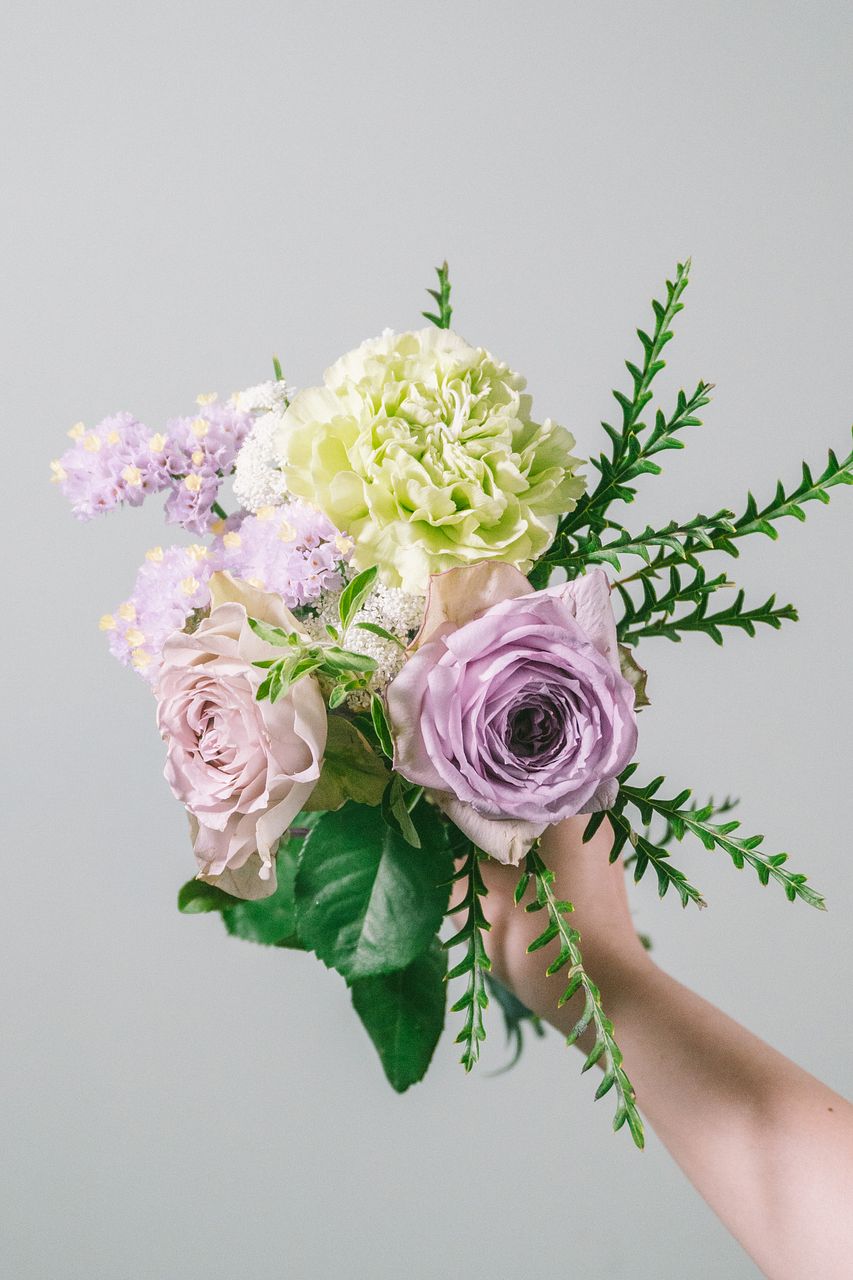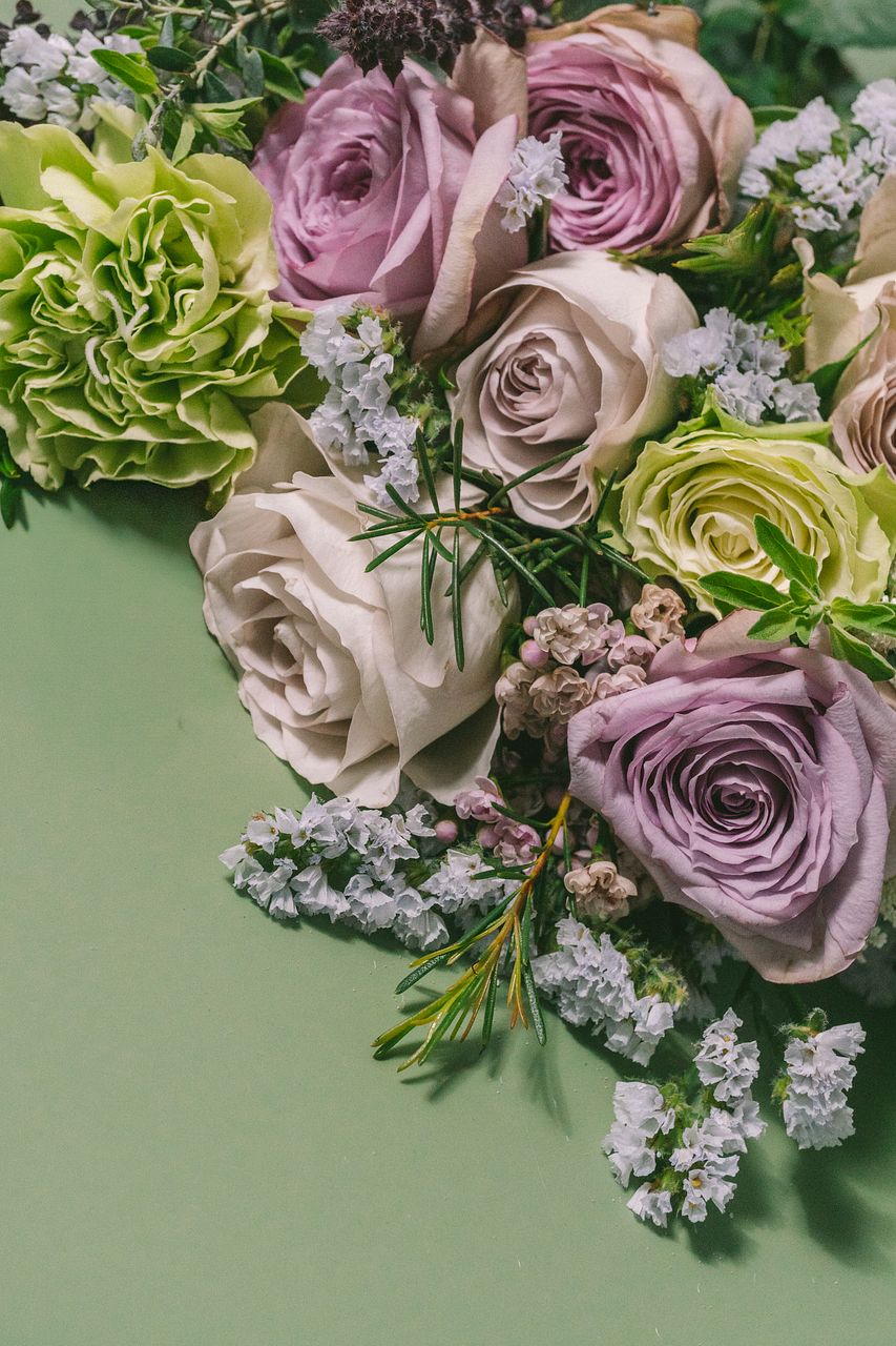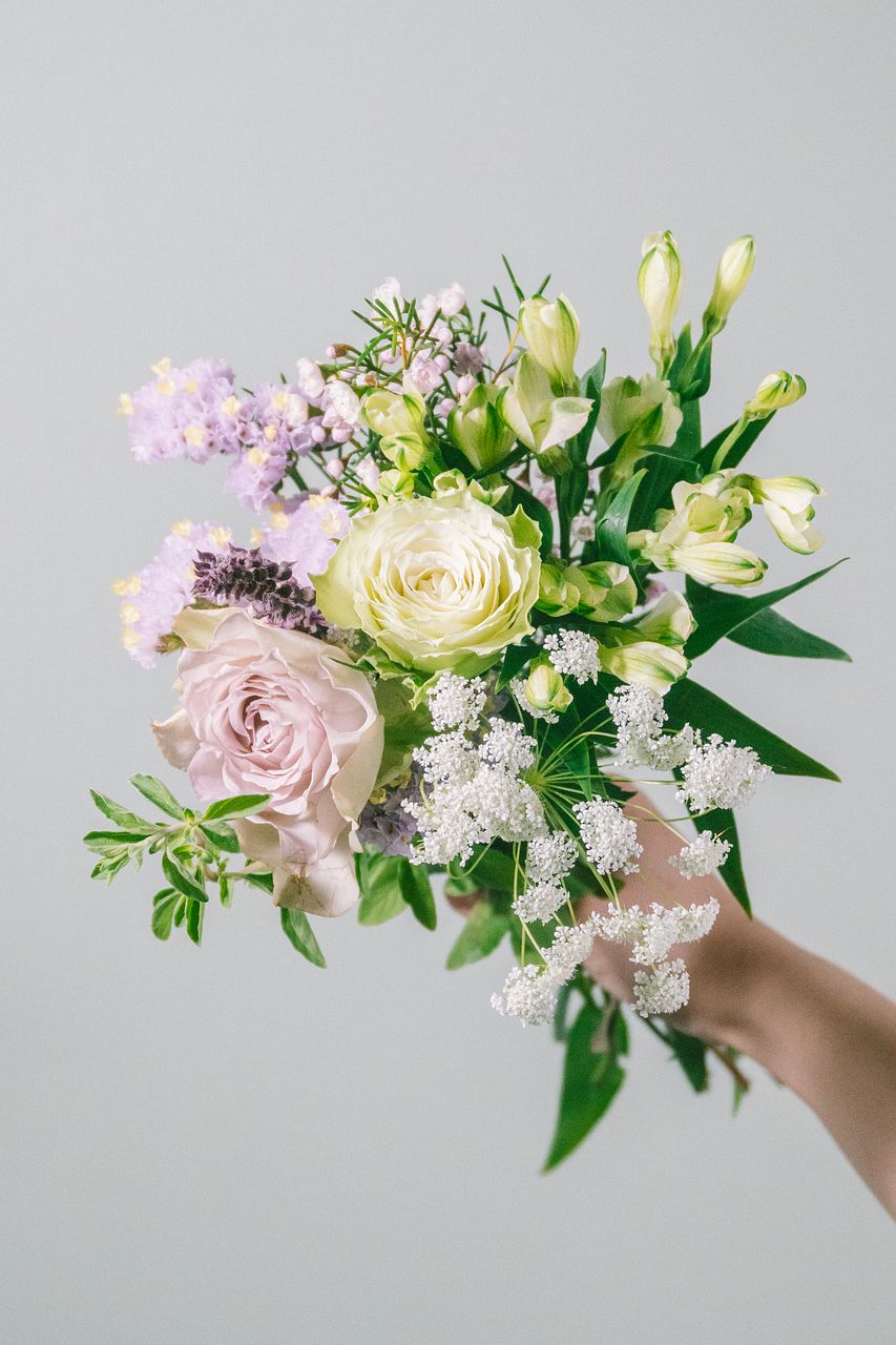 淡いパープルのバラを中心に、季節のグリーンやホワイト、柔らかなピンク色の花を束ねました。見る人の心をそっと癒します。