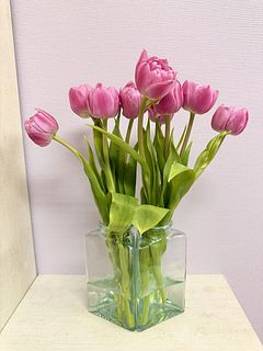 綺麗なピンクパープル系のチューリップが届きました。 SNSで見つけたチューリップの葉を筒にし、ワイヤーで連結してその中に生けるように飾りました。残りは花瓶に。フレッシュで色も好みだったので良かったです。