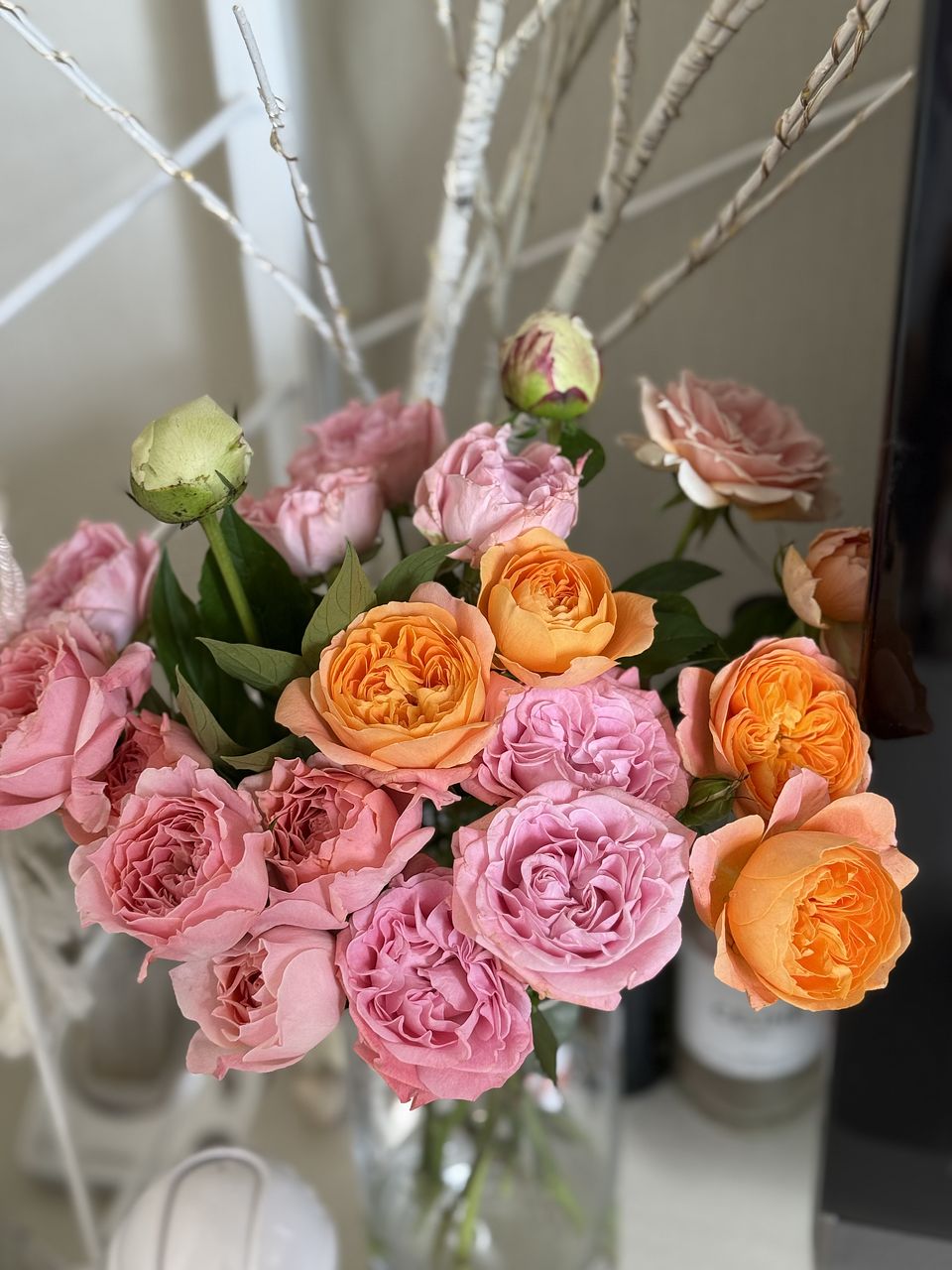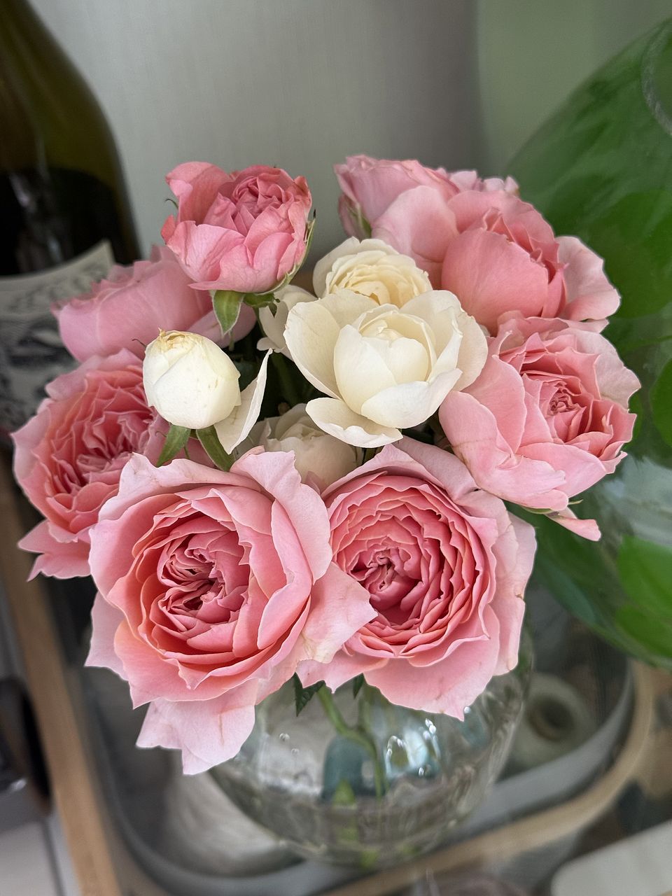 お家の花瓶に初めてくらいお花がたくさんぎゅうぎゅうになっています。バラも優しい色味で可愛らしく、芍薬も咲かせられるように頑張ってみます。