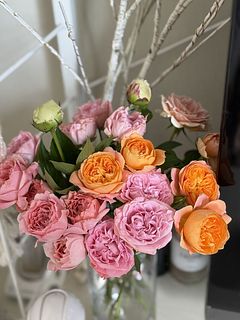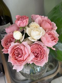 素敵な花束が届き、嬉しくなってその後3人に送りました。こんなに沢山の薔薇をいただいたのは初めてだと言って喜んでくれました。オールドローズのように見えるお花も数本あり、ボリュームもあります。芍薬が開くのが楽しみです。