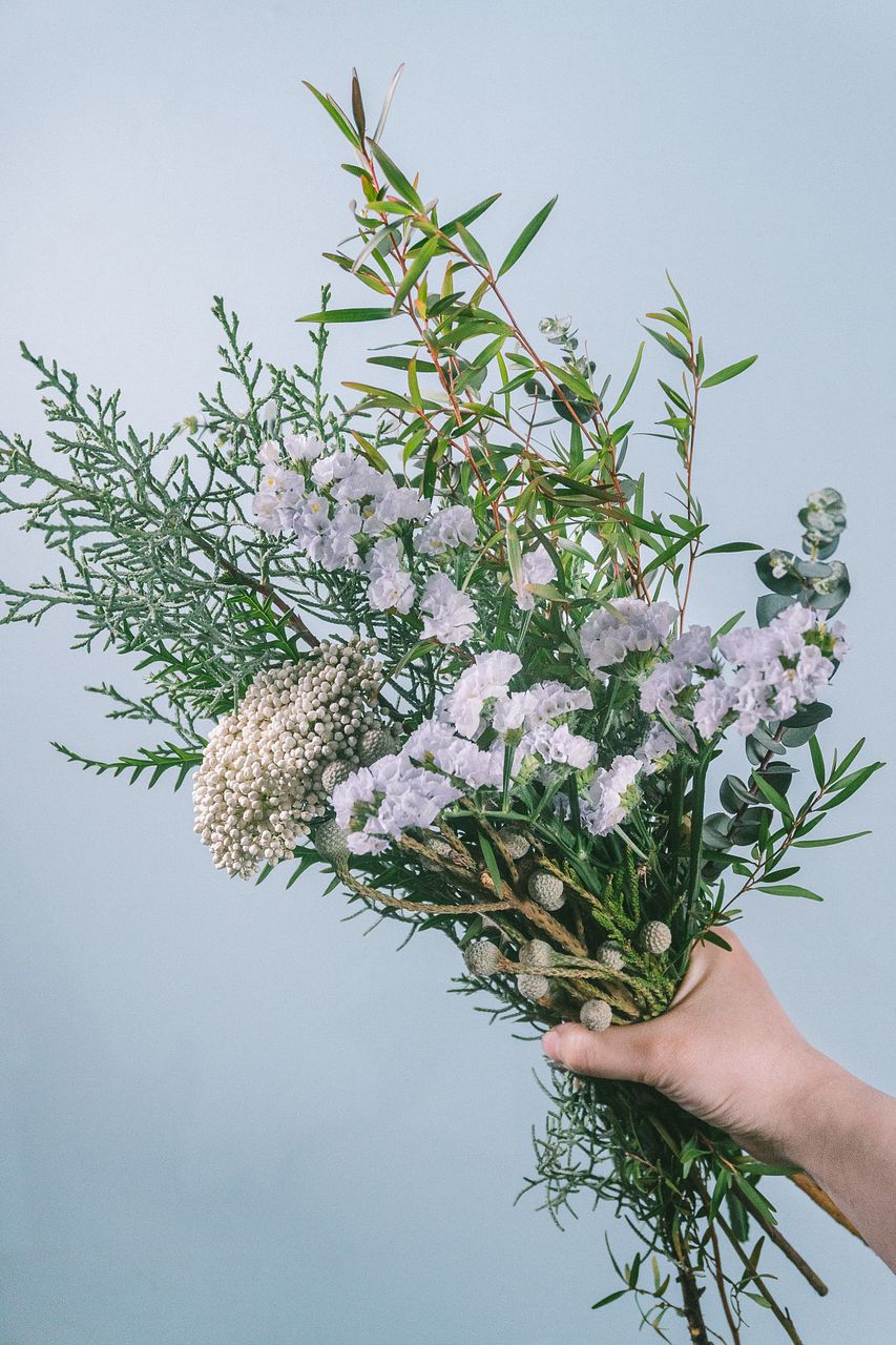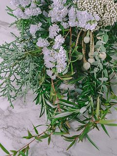 ドライにも向いている花材をチョイスしています。香りはだんだん弱まりますが風通しの良い場所に吊るしてドライにしてみてください。アロマオイルを1滴垂らしてもいいかもしれません。