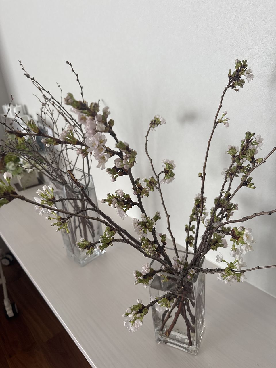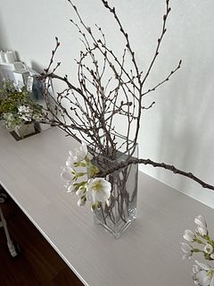 春の季節の枝物「吉野桜」🌸ホワイトやごく淡いピンクの花色で先端にぽんぽんと、まりのようにつくのが特徴です。