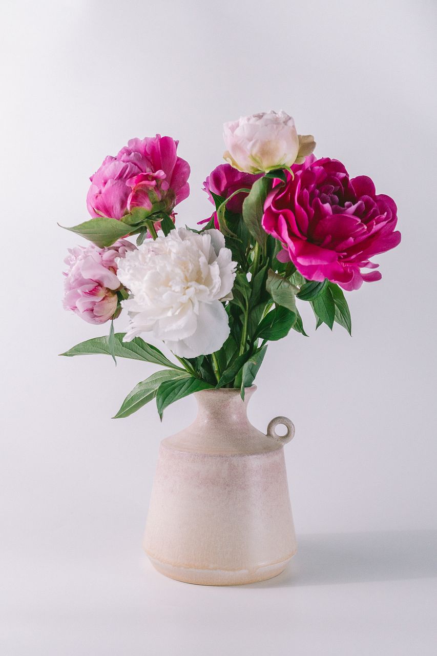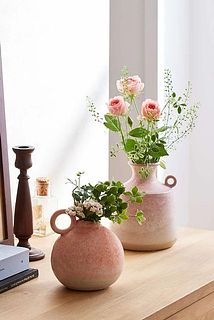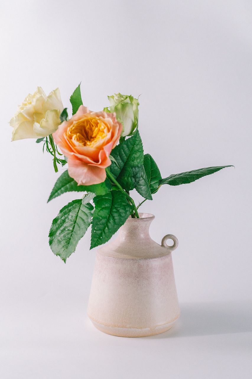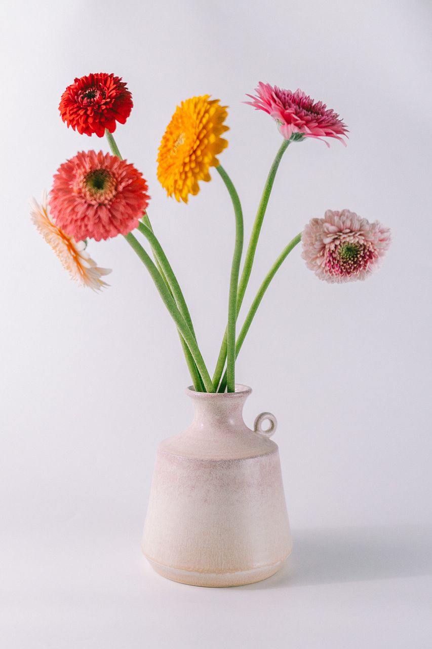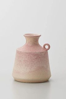 すっと伸びたネックと、さりげなく添えられた持ち手のフォルムが印象的。ほんのりと色づくやさしいトーンと、陶器ならではのあたたかみのある質感がポイントです。枝ものや動きのあるグリーンとも相性抜群◎