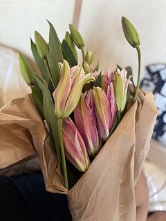 百合の中でも高価といわれる八重咲きの百合「エレナ」😍濃いピンク色の華やかな八重ゆりです🎀1本に花が3輪以上ついています。3本お届け。