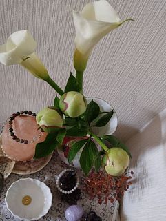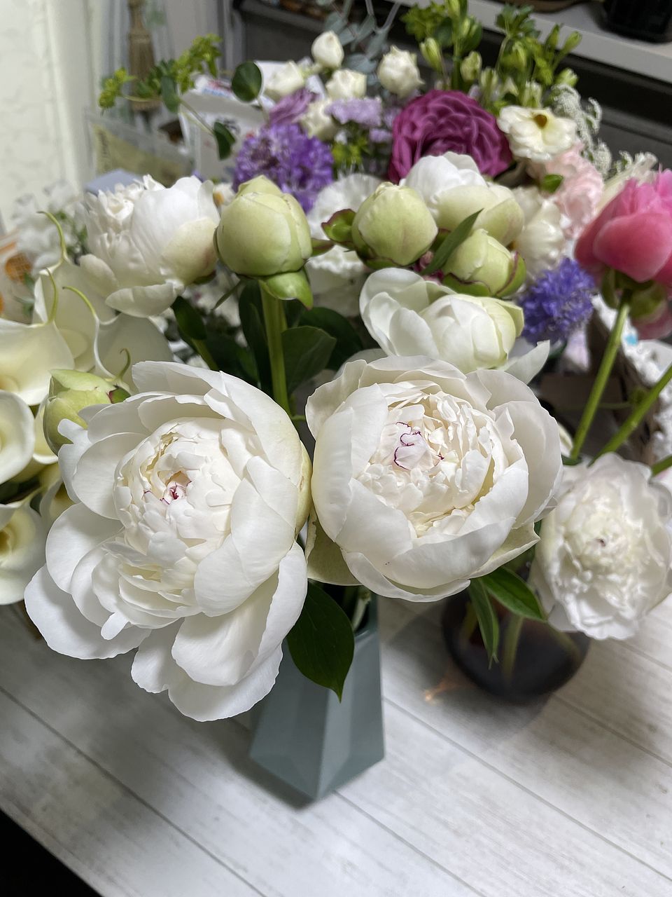 カラーも10本もあると花瓶にバサっと入れただけでとても大人な雰囲気で素敵です💖 芍薬は小ぶりでまだ蕾が固いですが、お手入れがんばってたくさん咲かせたいです✨ 芍薬はagataのブルーに生けました😍 白い蕾と葉っぱのグリーンがブルーのagataに映えます。 生き生きとした元気な芍薬でした。