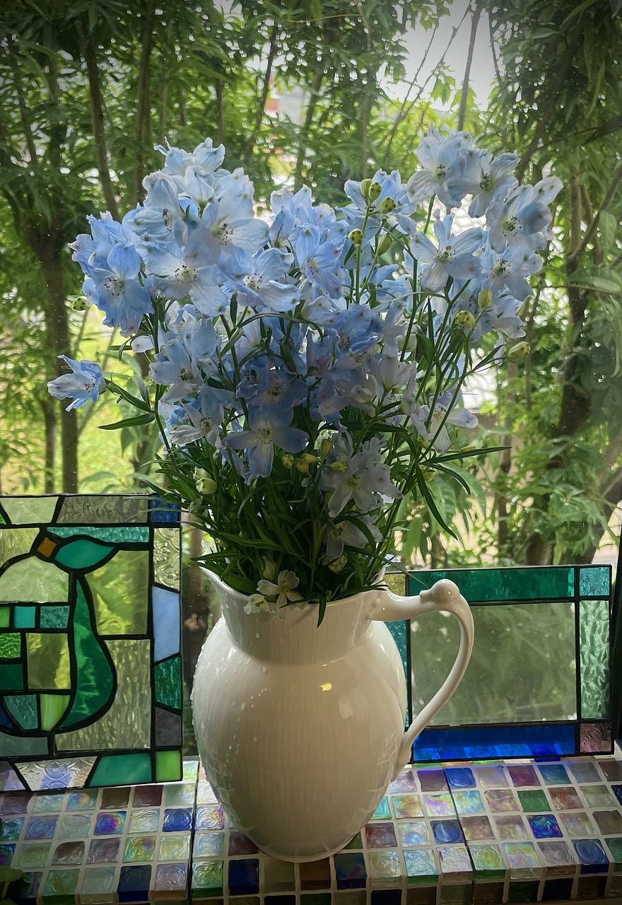デルフィニウムの名前は咲く前のつぼみの形がイルカに似ていることから、ギリシャ語でイルカを意味する「delphis」が由来🐬