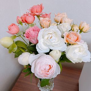 甘いピーチミルクのようなカラーリングの芍薬とバラを贅沢に束ねました🍑🐮