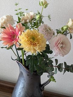 春の花束をありがとうございました、もう少しインパクトのある色が入ってもいいと思いました、マムまで入っていたのはびっくりです、素敵な香りを漂わせてくれています、まとまって、デザイン、いるのでそのまま花瓶にいけられました。