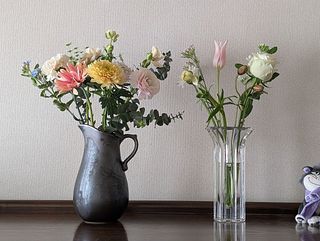 flowerさんで今まで購入した中では一番ボリュームがすごかったです!初めて花瓶2つに分けました。バラ、ラナンキュラス、ストック、チューリップ、カラーが届き、色も春色だったり、珍しい複色もあったりして、見るたび「可愛い!」が止まりません。