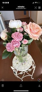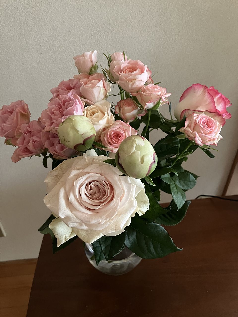 わが家に届いたブーケは、ピオニー3本、スプレーバラ3本、大きめなバラ3本。