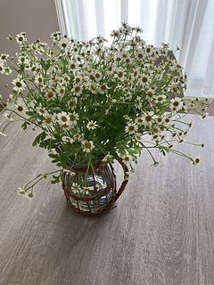 飾るときのポイントは、マトリカリアの下葉を少し取り、空気が通るようなイメージでやさしくほぐしながら広げるのがおすすめ。