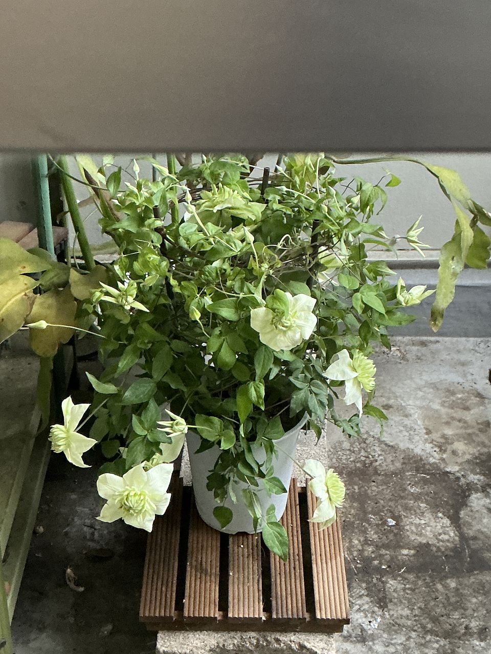 淡い黄緑色から白色へ変化する八重咲きの花が特徴のクレマチス。変化していく色の移ろいも楽しめます😉