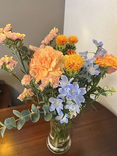 清涼感のあるブルーとジューシーなビタミンカラーのお花を組み合わせたおまかせブーケ🍋🍊