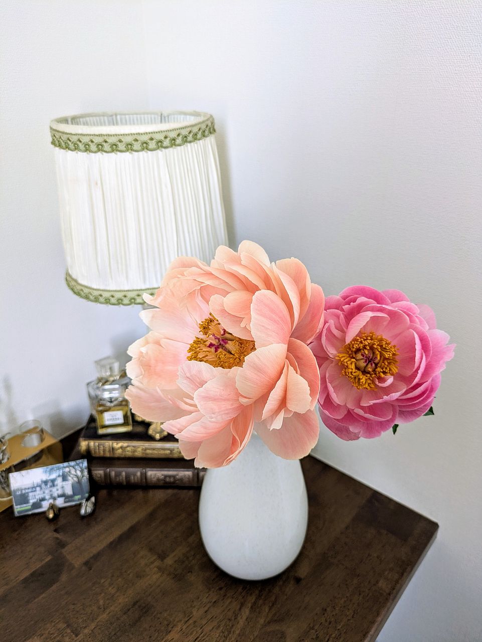 半八重咲きのコーラルカラーの芍薬🧡「コーラルチャーム」または「コーラルサンセット」、「ピンクハワイアンコーラル」からおまかせで4本お届けします。