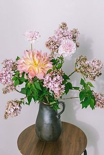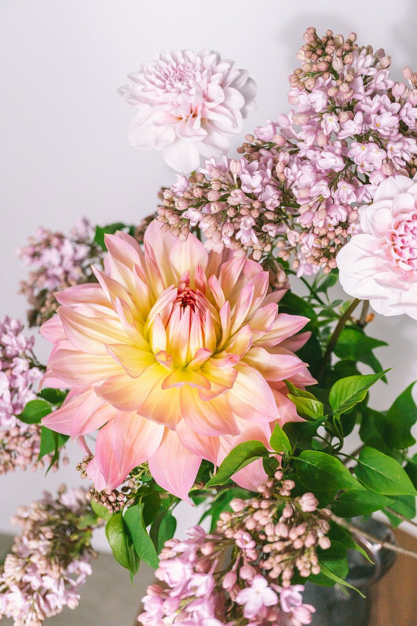 存在感のあるダリアと、やさしく香るライラックを組み合わせた