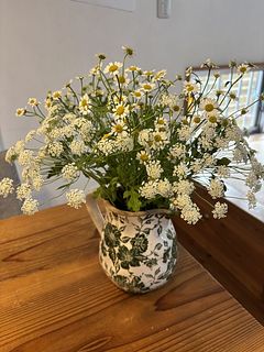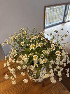 繊細なレースフラワーと小花が可愛いマトリカリア。一緒に併せると本当にこんもり❣️ 別々に束ねられて届くので それぞれ丁寧にほどいて葉を取り除きました。カワイイ〜😍 マトリカリアはそっとほどかないと折れてしまうので時間を作って処理し水揚げします。 折れてしまってもたっぷりあるので安心です😊 テーブルの上に小さな草原ができました♡ 眺めていると心が洗われます🥹 折れたものは小さい花瓶に飾ると これまた可愛くてどんなお花と併せても合う万能なお花で注文して良かったと思いました♪