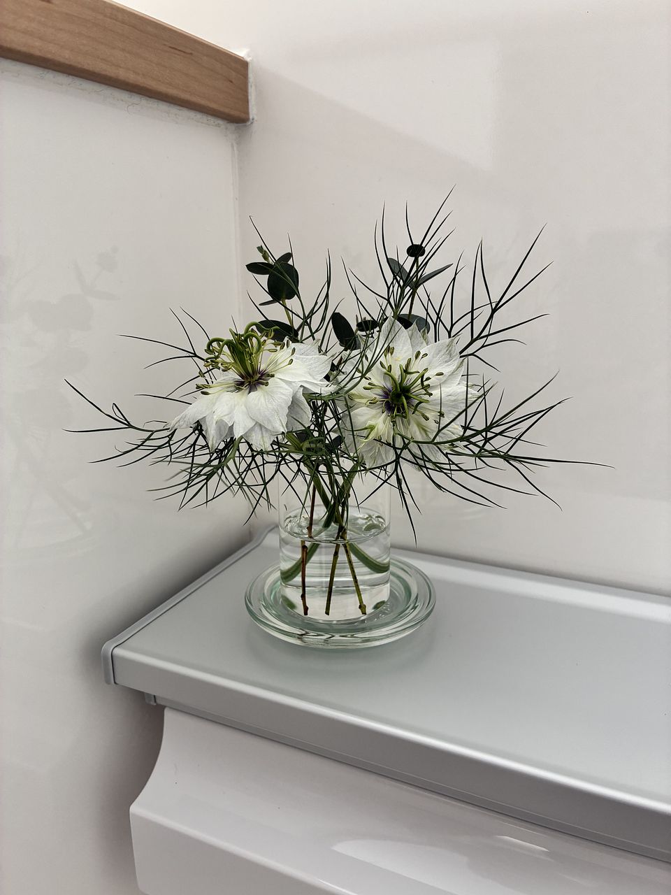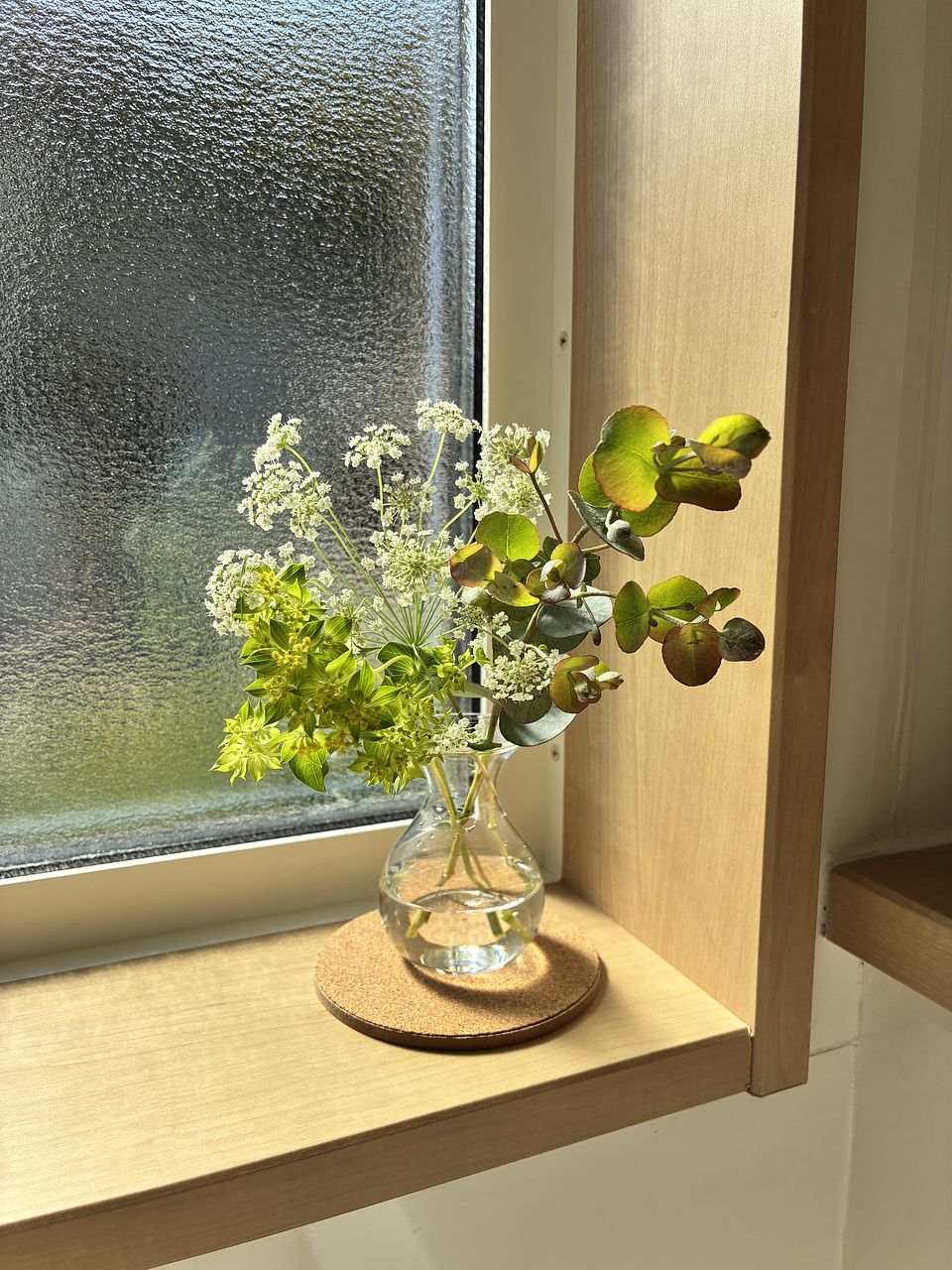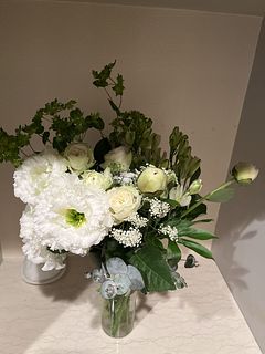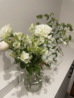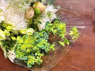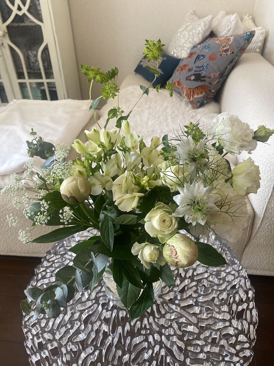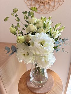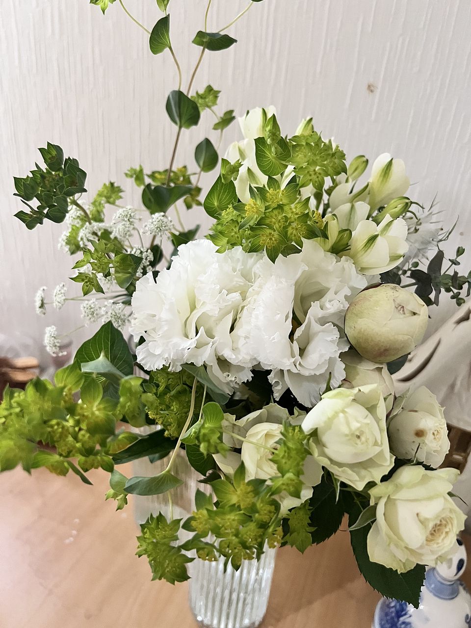 白とグリーンが爽やかで今の時期にぴったりでした。買ってから1週間ほど経ちますが、芍薬はこれから開きそうで、長く楽しめるのが嬉しいです。