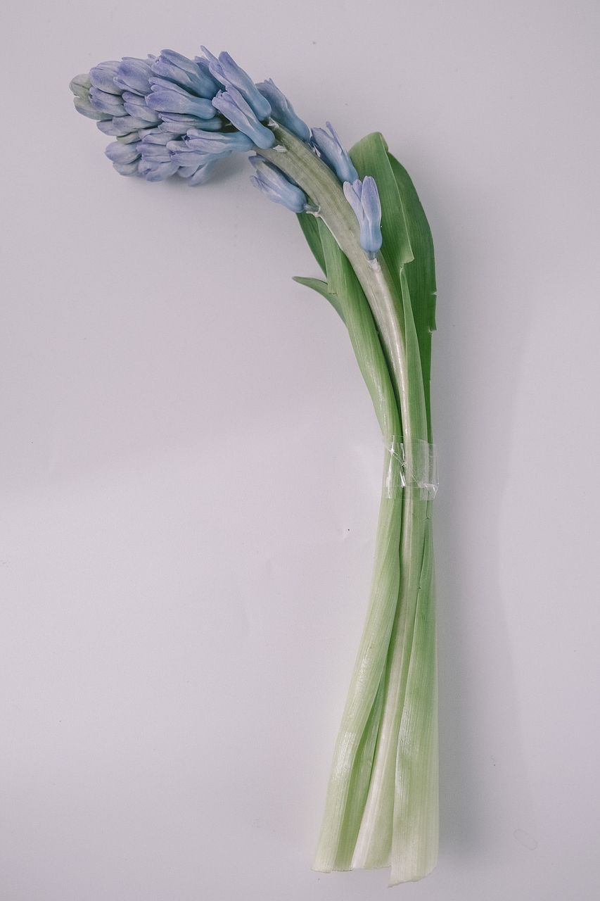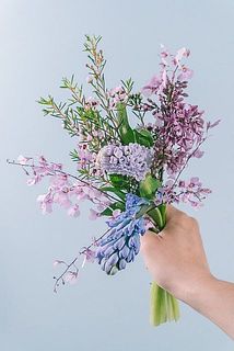 淡いブルーのヒヤシンスを中心に、ピンクのオンシジウムとライラックがやわらかく広がるブーケ。
