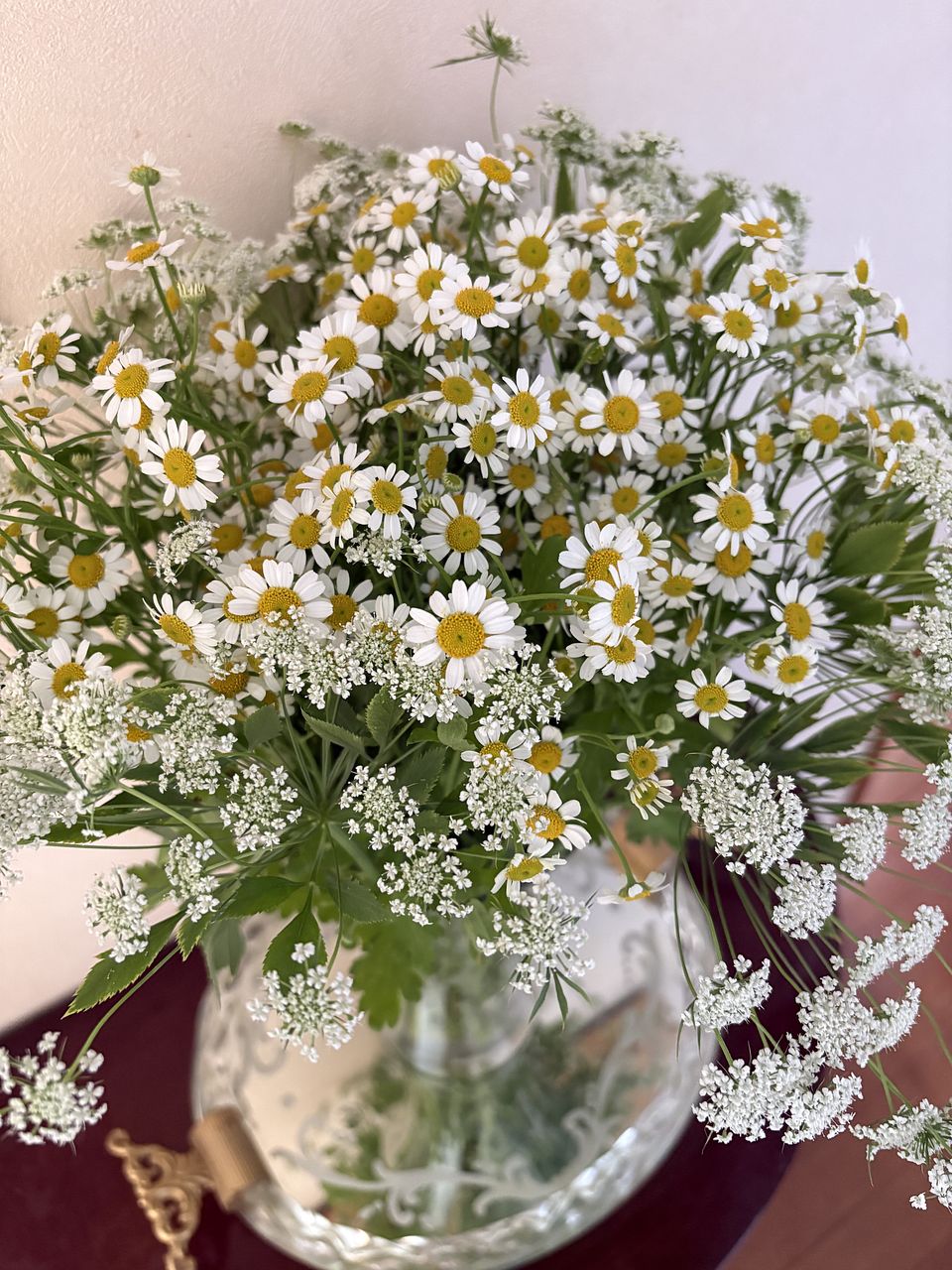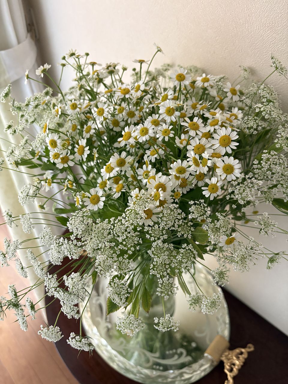 ふわふわゆれるマトリカリア「シングルペグモ」と「ホワイトレースフラワー」をたっぷり束ねました💐