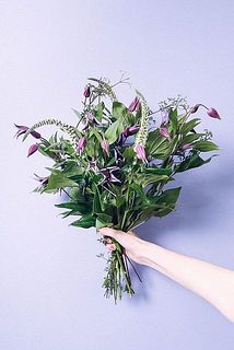 クレマチス「ブルーピルエット」をたっぷりと。ベルのような形が愛らしいお花です。花言葉は「精神の美」。ふわふわのベロニカをアクセントに🐈
