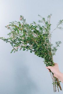 さわやかな香りがする枝物「銀香梅」を添えて。光沢のある葉っぱをこすると香りが広がります。ヨーロッパでは「祝いの木」といわれ、愛や幸せ、喜びを象徴するとされているそう。