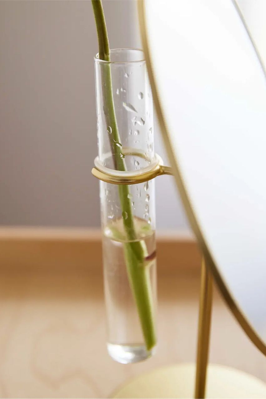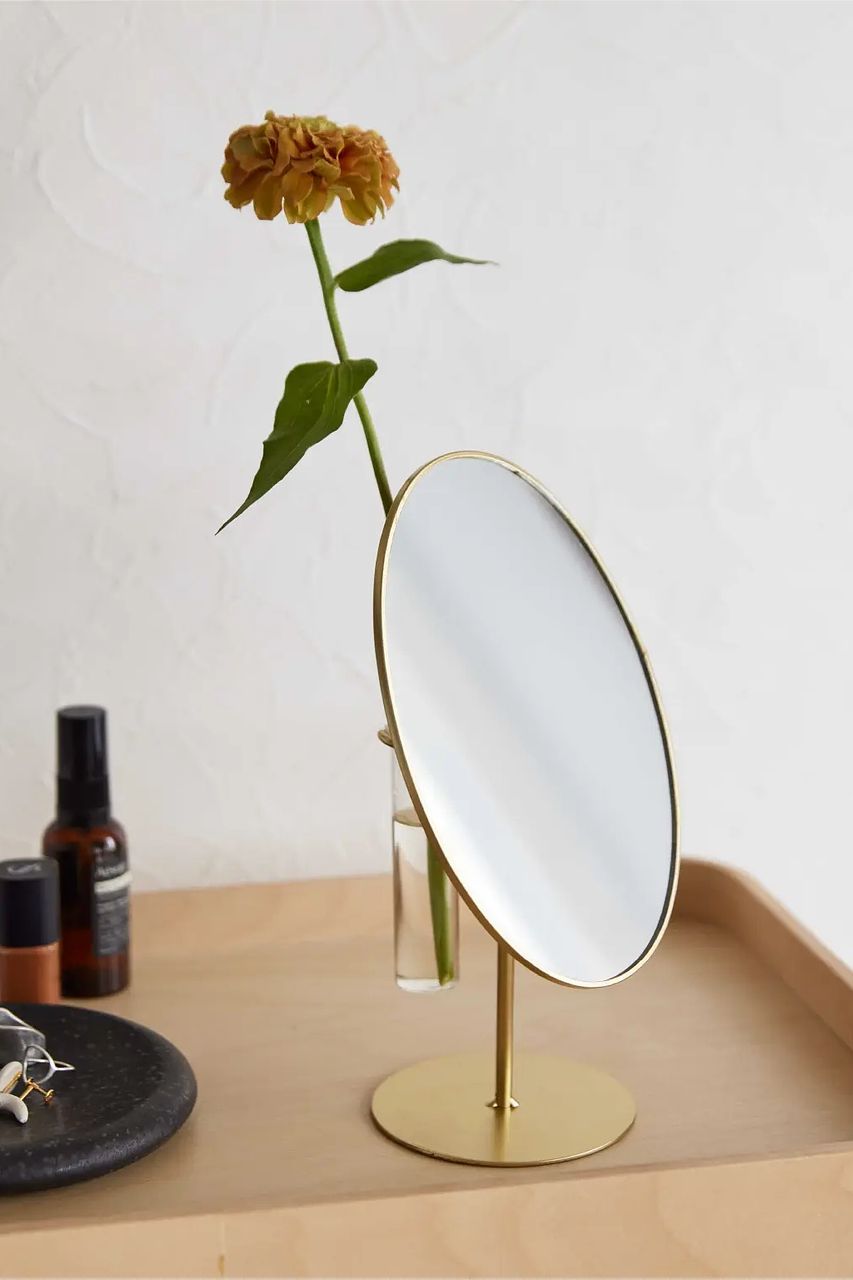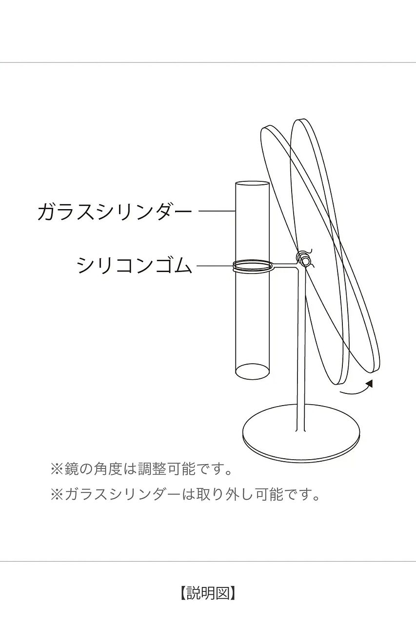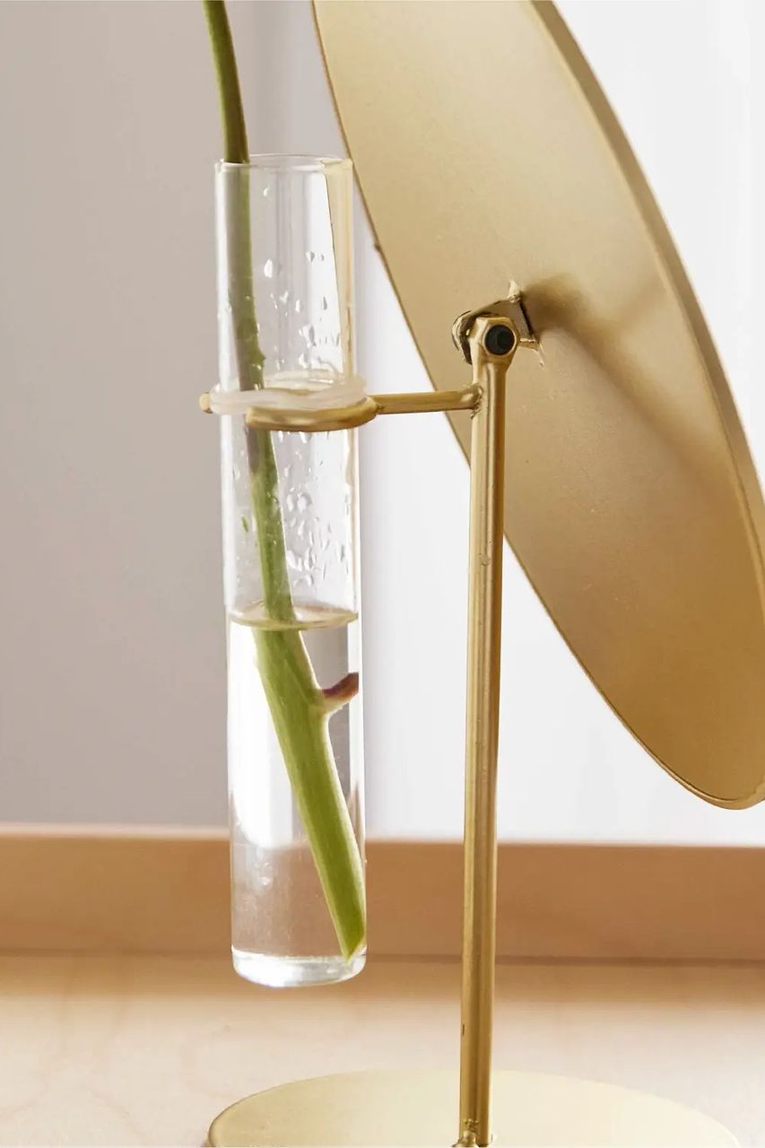鏡の背面にはガラスシリンダーが隠れていて、一輪の花をすっと差すだけで雰囲気が変わるのも魅力。花を飾らないときは、そのままミラーとして使えるのも嬉しいところ。お部屋にすっと馴染むゴールドのフチもポイント。