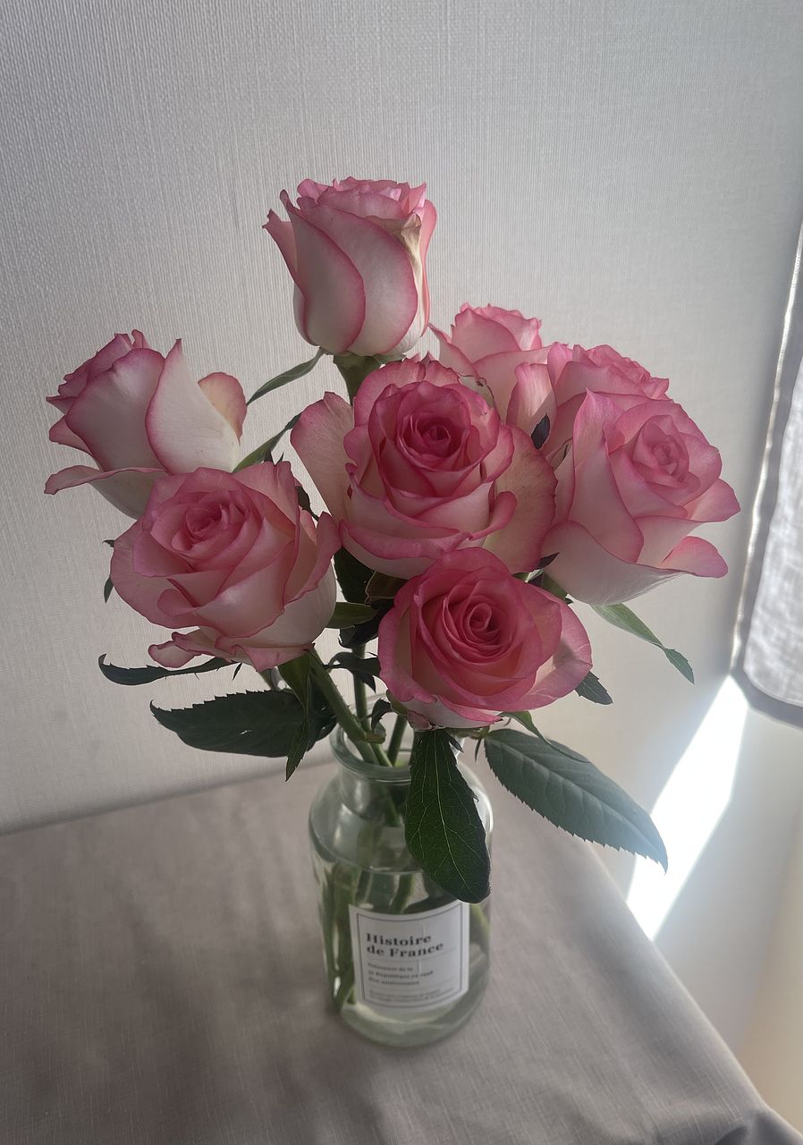ピンクの縁取りがかわいいバラ「ジュミリア」をお届け🌹ころんとした咲き姿と複色の花びらがチャームポイントです。スイーツのようにあまいカラーリングがキュート🍰