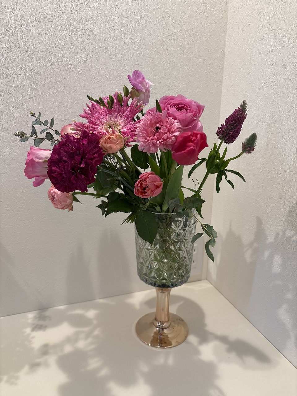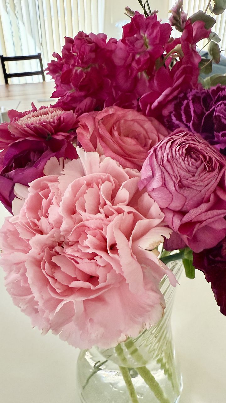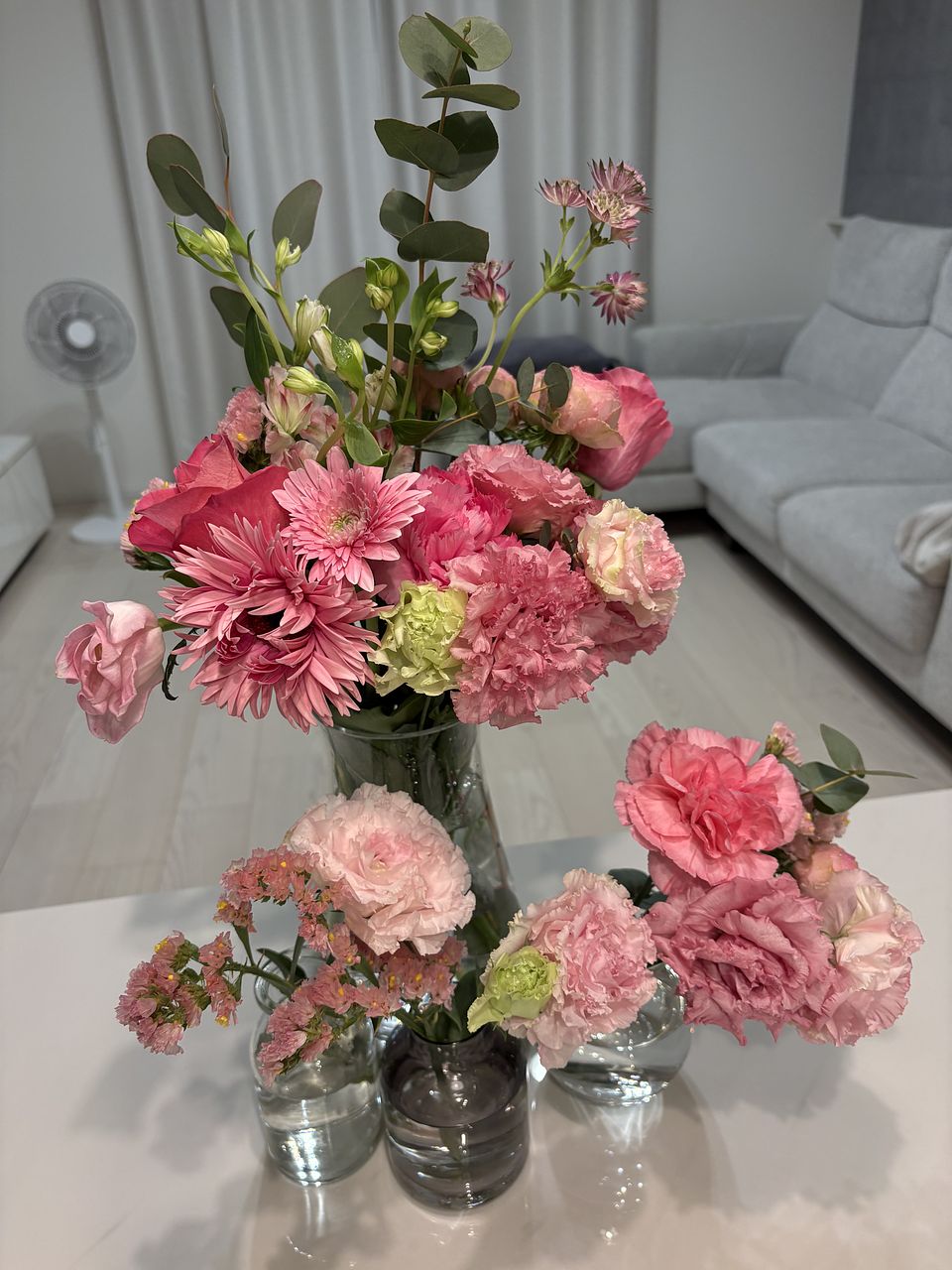 とても愛らしいピンクのお花たちが届きました♡ 8割をまとめて華やかに飾り、残りは小さな花瓶にわけて楽しむことができました