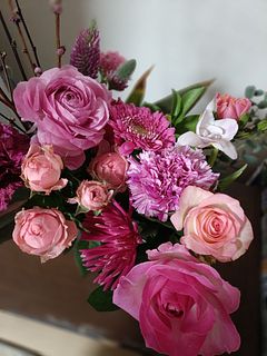 2つ頼みましたが、ひとつめは商品説明どおりのブーケの組み方で、もうひとつのブーケはいろいろな種類のお花がわんぱくにはいっていました! とにかく香りの良いものがたくさん! 思った色と違うものも混ざっていましたが、ひと月楽しめるくらいの充分なボリュームでしたから はじめての購入で満足感も味わえました!