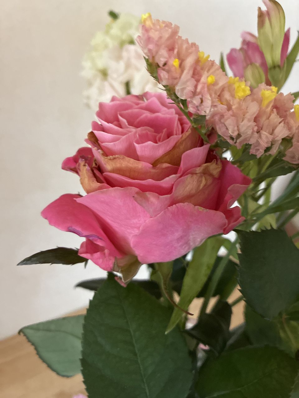 コデマリが入っていて、動きのある春らしいブーケでした。ちょっとバラがお疲れ気味、チューリップの花びらが1枚めくれあがってましたが、全体的には満足です。小さいのも入れて11本入ってました。