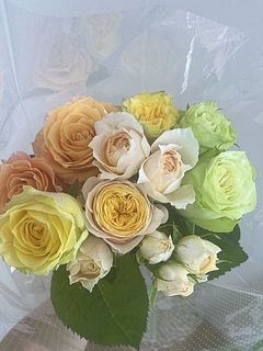 初めて頼んでみました!配送で少し傷んだ花ビラもありますが、外せば大丈夫です。水揚げしたらスプレーバラもシャッキリしました。 メロンぽいグリーンは一本でしたが、黄緑ぽいレモンフォセットが2本、ピンクと黄色グラデのプリシラローズ他、全体的に淡い色合いで綺麗です。お値段考えたら十分です!