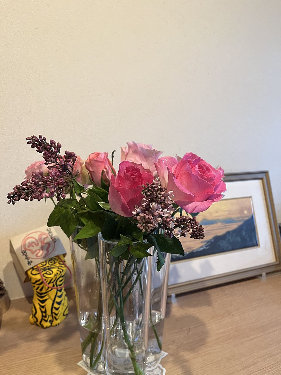 初めてのライラックと、バラが色も合っていて、よかったです! ライラックからもバラからも香りがして癒されています‼️