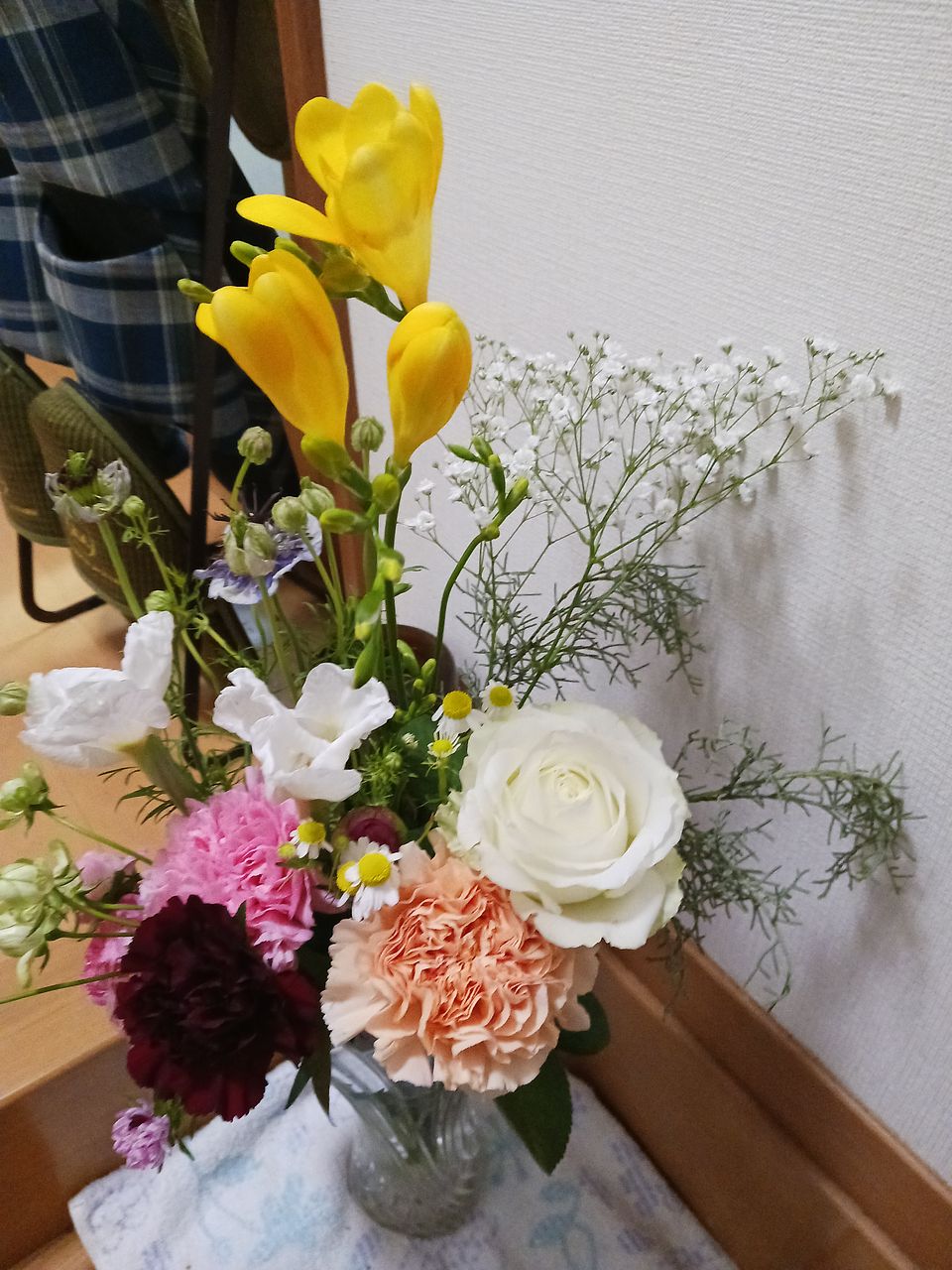 私の好きなスイートピーとフリージアが入っていました。他に可愛らしい色合いのお花もたくさんで、お部屋が明るくなりました。