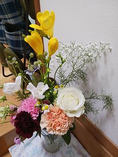 春の花束をありがとうございました、もう少しインパクトのある色が入ってもいいと思いました、マムまで入っていたのはびっくりです、素敵な香りを漂わせてくれています、まとまって、デザイン、いるのでそのまま花瓶にいけられました。