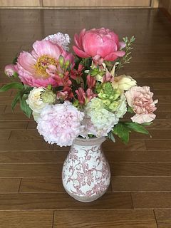 高級な芍薬(ピオニー)を主役に、色とりどりの旬の花々をたっぷり束ねた特別なブーケ。