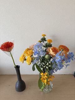清涼感のあるブルーとジューシーなビタミンカラーのお花を組み合わせたおまかせブーケ🍋🍊
