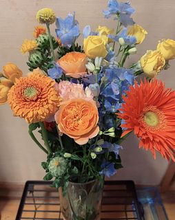 紅花がキレイだし、あまり見ないのでよかったです。あとは、オレンジと黄色バラ、オレンジのガーベラ、ピンクカーネーション、デルフィニウム(ブルーと薄いブルー)、アリウム・カエルレウム。彩りキレイです。花の外側が少し傷が入っていたりしますが、取れば問題なし。