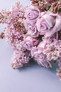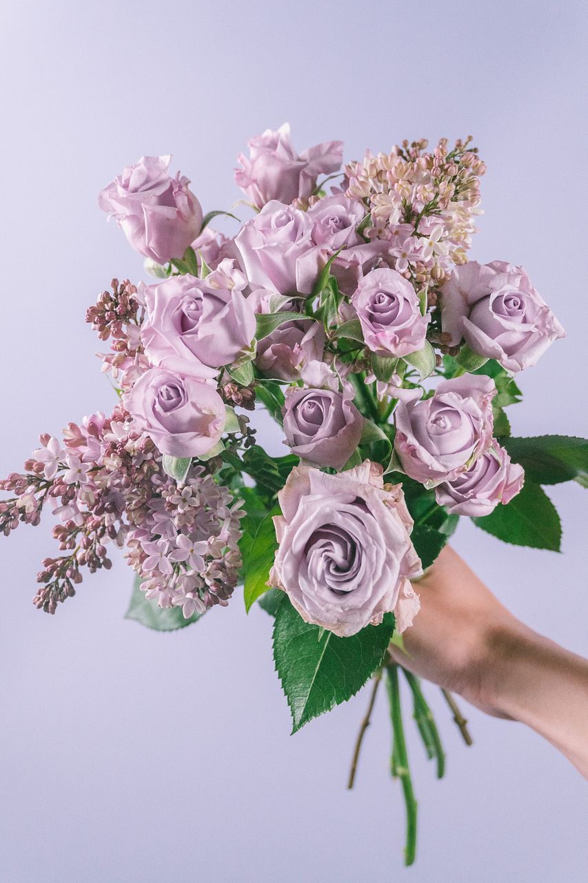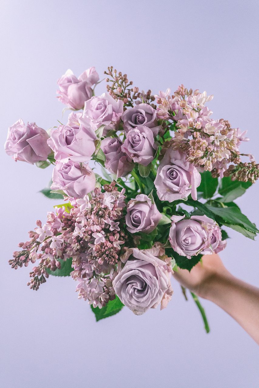 上品でエレガントな雰囲気に。ライラックとバラ合わせて6〜7本お届け。