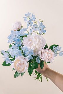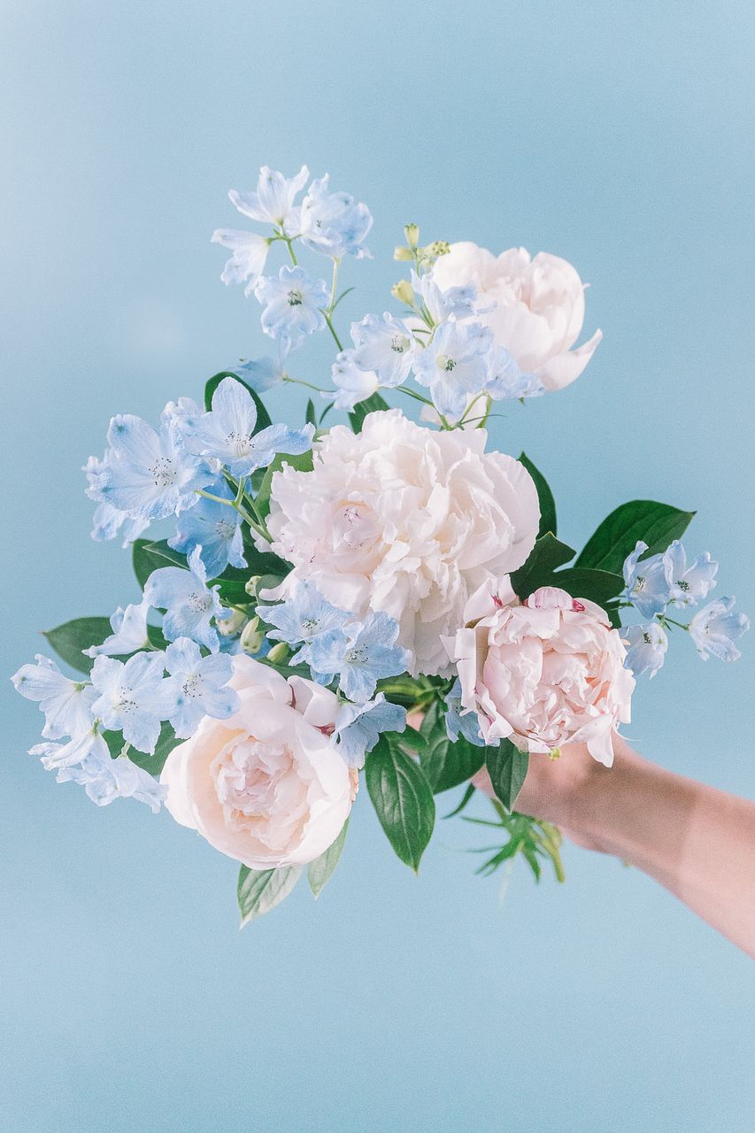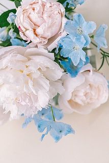澄んだブルーのデルフィニウムと、やわらかく咲きほころぶ白い芍薬🕊️🫧