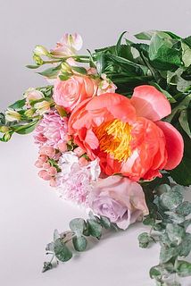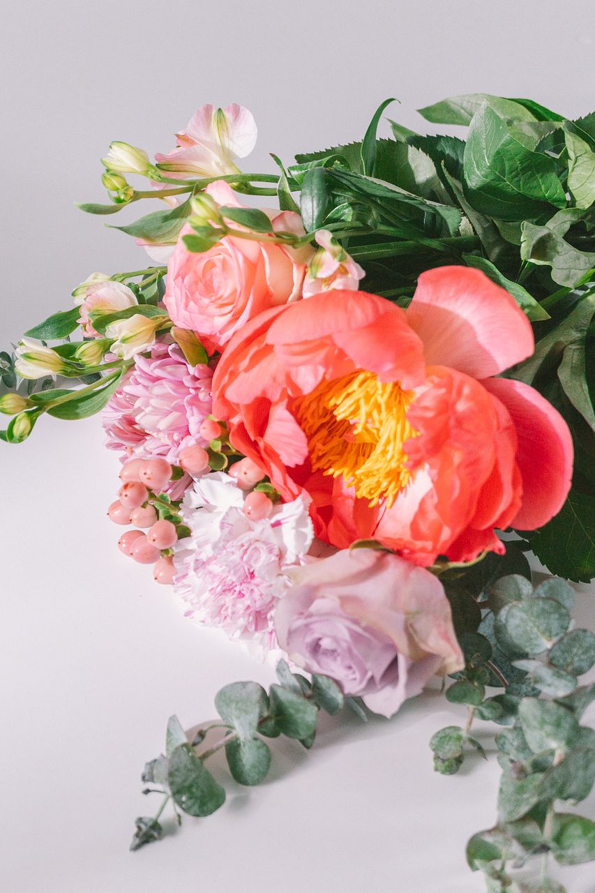 大きく開くシャクヤク「ルーズベルト」に、カーネーション「ユカリチェリー」がアクセントに。