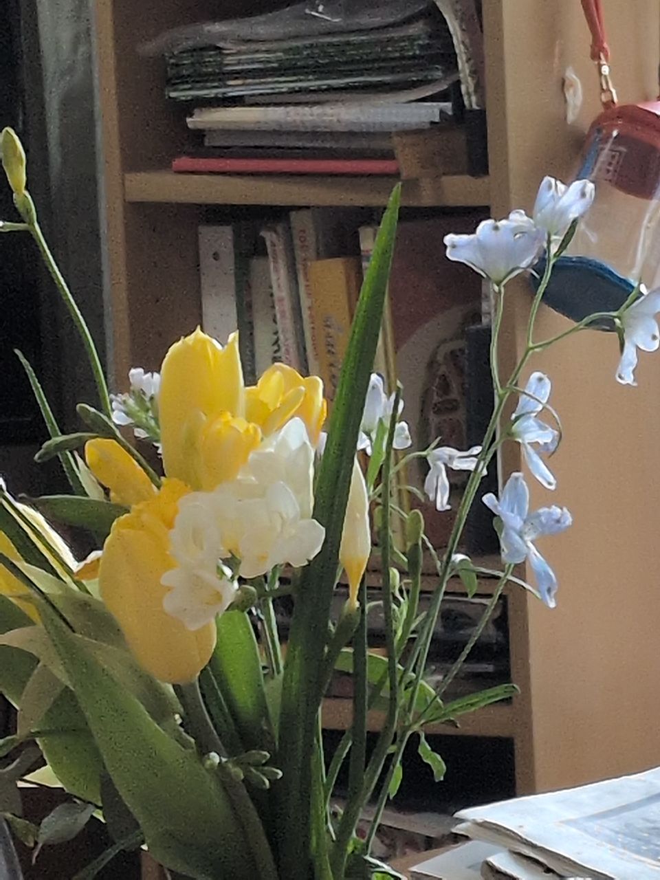 チューリップ、スイートピー、ラナン、大好きがいっぱい詰まったブーケでボリュームもめちゃくちゃありました。いつも有難うございます。春の香りと色にほっとします