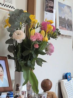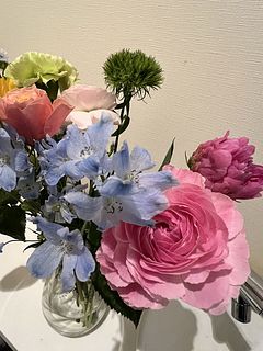 バラのいい香りと春色の花束が素敵でした オレンジ色のラナンキュラスかなと思われる花が一本花びらが散ってしまってましたが。