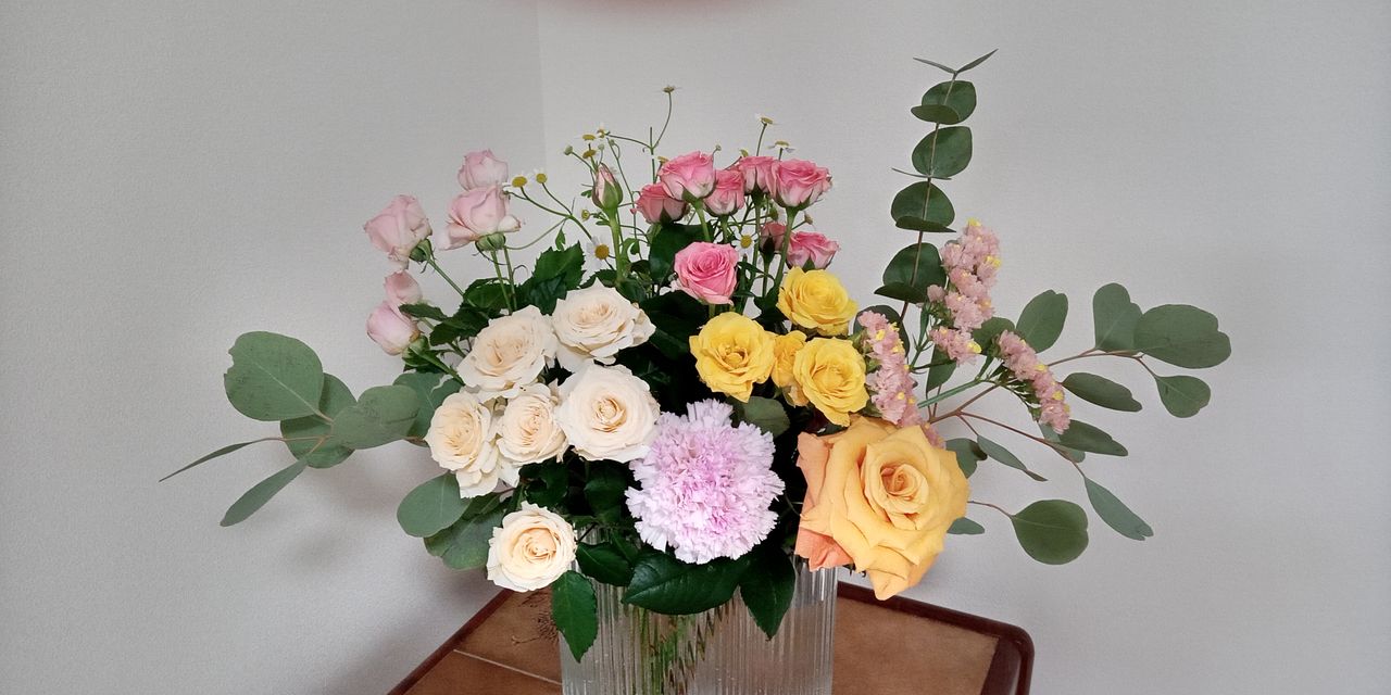 どんなお花が届くのかとても楽しみにしていました♪期待していた以上のお花の種類がありプレゼントをいただいたような気持ちになりました♡イエローとグリーンの組み合わせがとても爽やかで癒されました♪素敵にブーケにしてくださってるので、ばらさずにそのまま花瓶に入れて飾っています♡