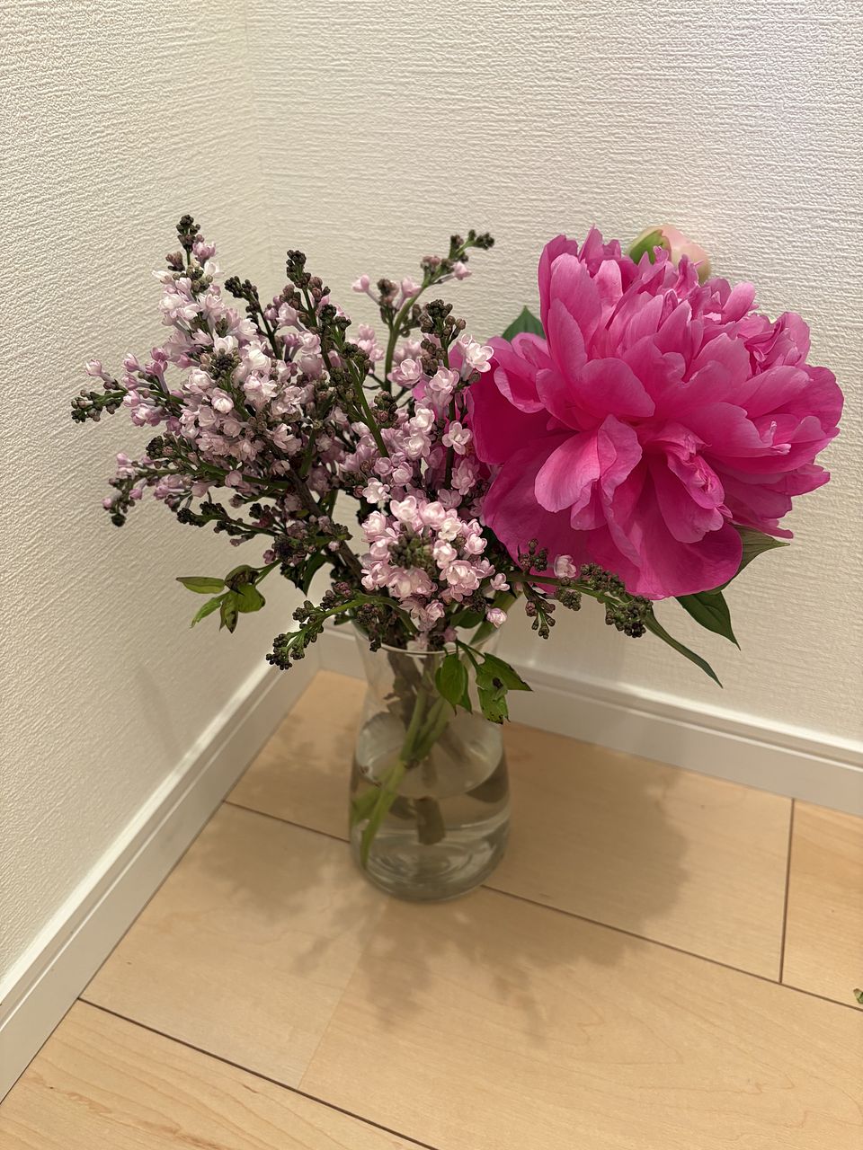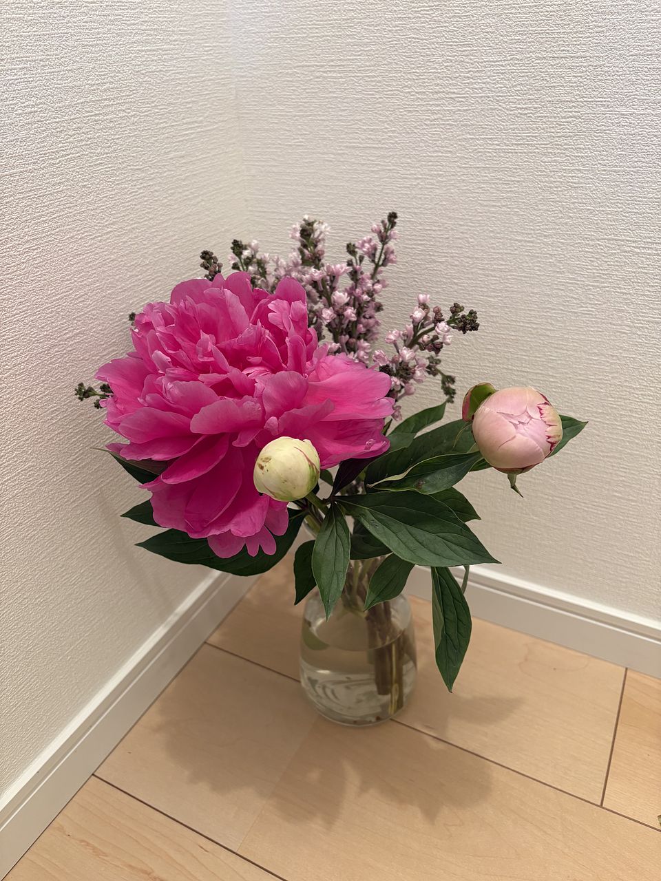 とても可愛いお花が届きました✨ ピオニーはふんわり咲いた物と柔らかい蕾の物、硬い蕾の物の3本と、ふわふわのライラックが2本入ってました! 花瓶はファゴットに飾って、ボリュームは少し寂しいですが、ちょうど良い長さでした。 ピオニーの硬い蕾が綺麗に咲く様に頑張ります💕