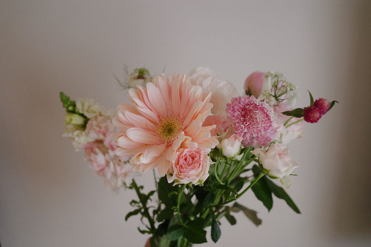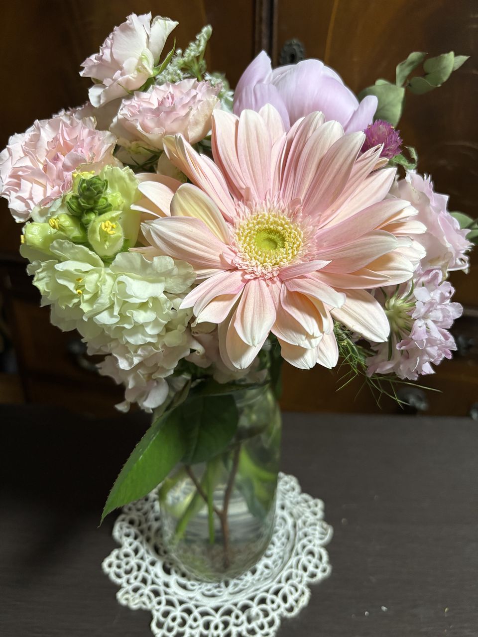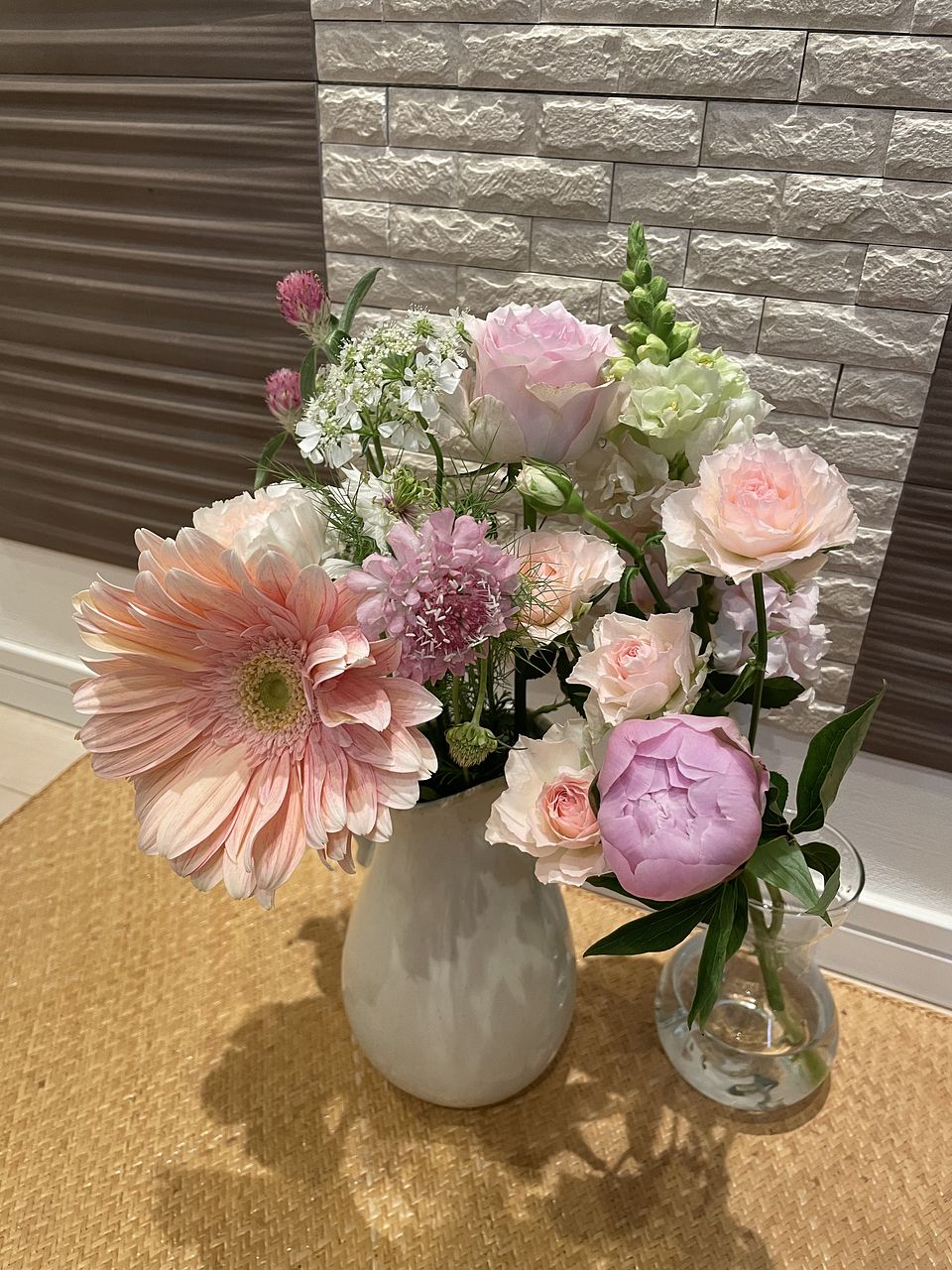 大輪ガーベラがインパクトのあるキレイなブーケでした💐蕾の芍薬、きれいに咲いてくれますように〜。